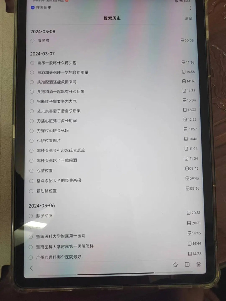 根据杨某东的手机购物记录显示,在案发前他一直购买了4把刀,其中3把还是作案前一天购买。杨某东的平板上,还发现了他曾搜索过关于心脏位置、动脉位置、刀插心脏、扭断脖子、割破喉咙、格斗杀招等杀人的方法,以及“丈夫杀害妻子后自杀后果”“刀穿过心脏会死吗”等搜索记录,他还曾通过网络咨询精神病医生关于“精神失常的人犯法需要承担责任吗”的问题。