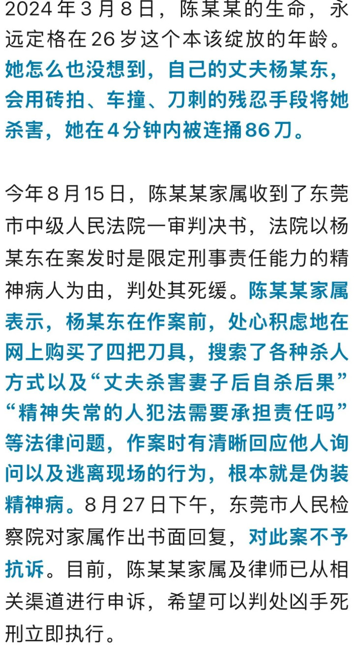 据《不抗诉理由说明书》显示,杨某东故意杀⼈⼀案,经东莞市检察院审查认为不符合抗诉条件,于8月22日作出不抗诉决定。为提高刑事抗诉工作的透明度、公信力和权威性,现将本案不抗诉理由说明如下: