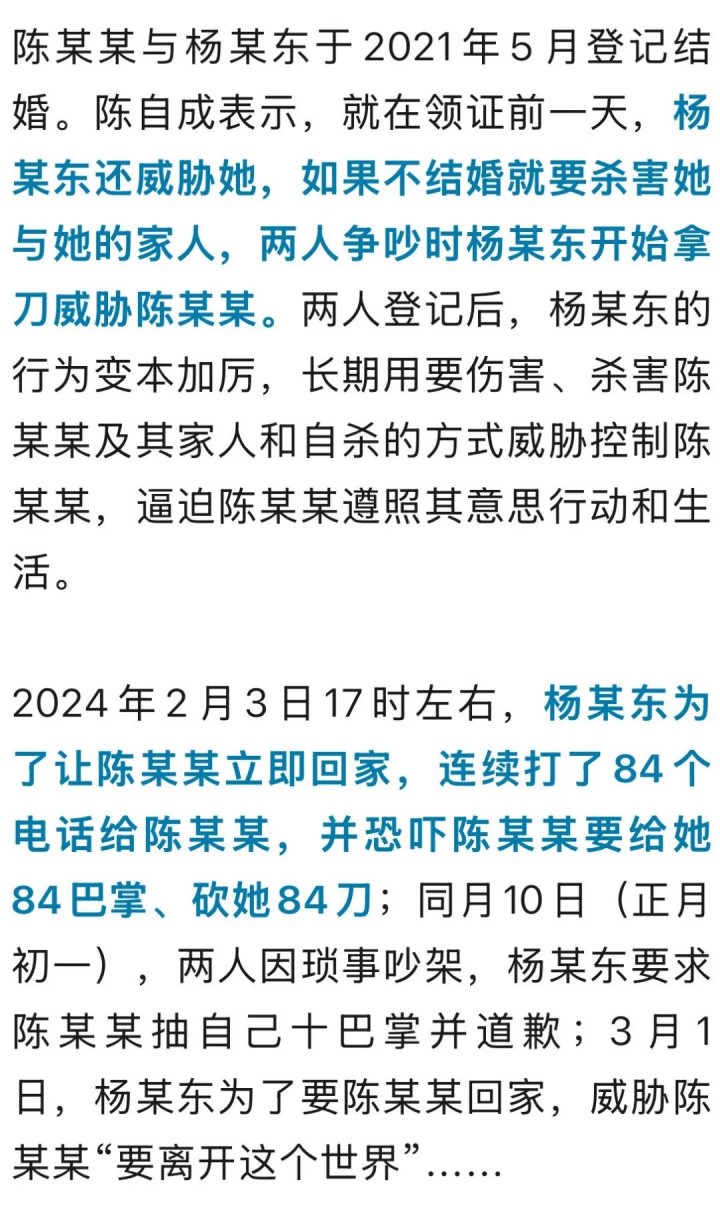 两人相处久了后,杨某东的性格缺憾便慢慢显现。陈某某的妹妹表示,杨某东一直以来在精神上控制她姐姐。杨某东不允许陈某某与异性接触,一旦她与朋友外出,他便会疯狂打电话甚至报警、跟踪。到了后来,他干脆就强逼陈某某带他一并外出。“我姐姐与朋友出去吃饭,他就会在旁边另开一桌,监视着姐姐的一举一动。”